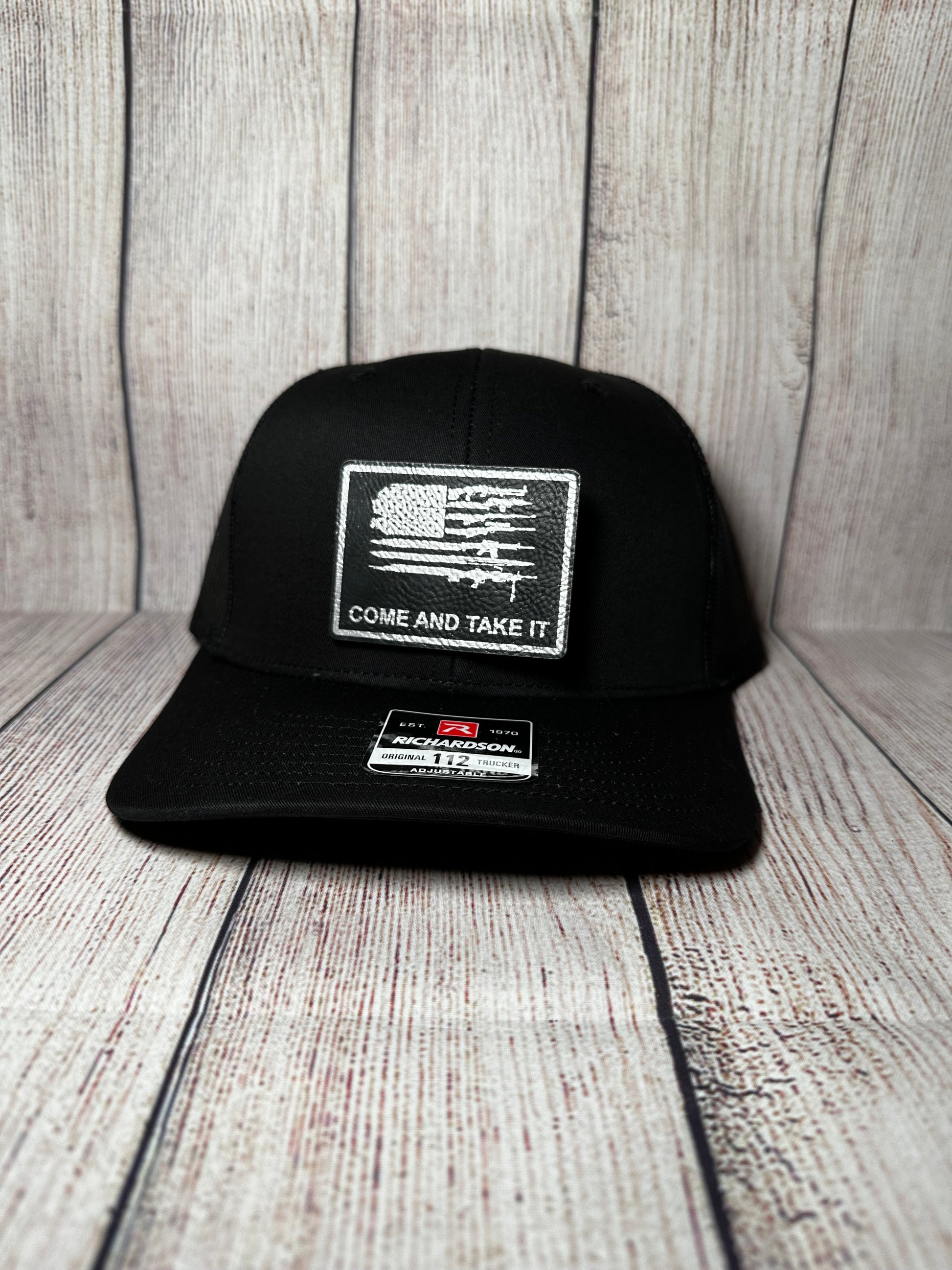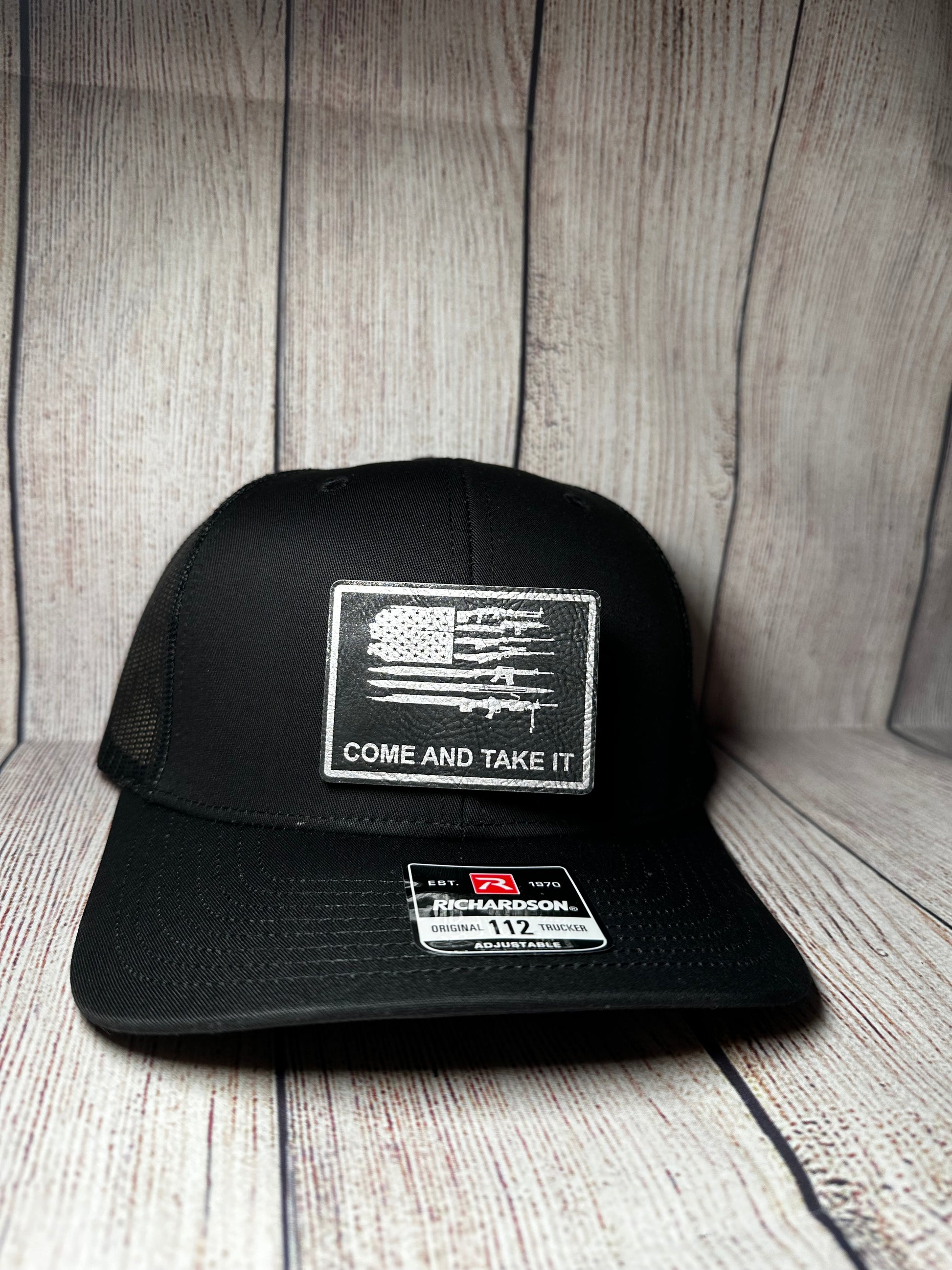 Come and take it with American flag and guns. Please choose your hat style and leatherette color. If you want a hat color different than black, please message me!