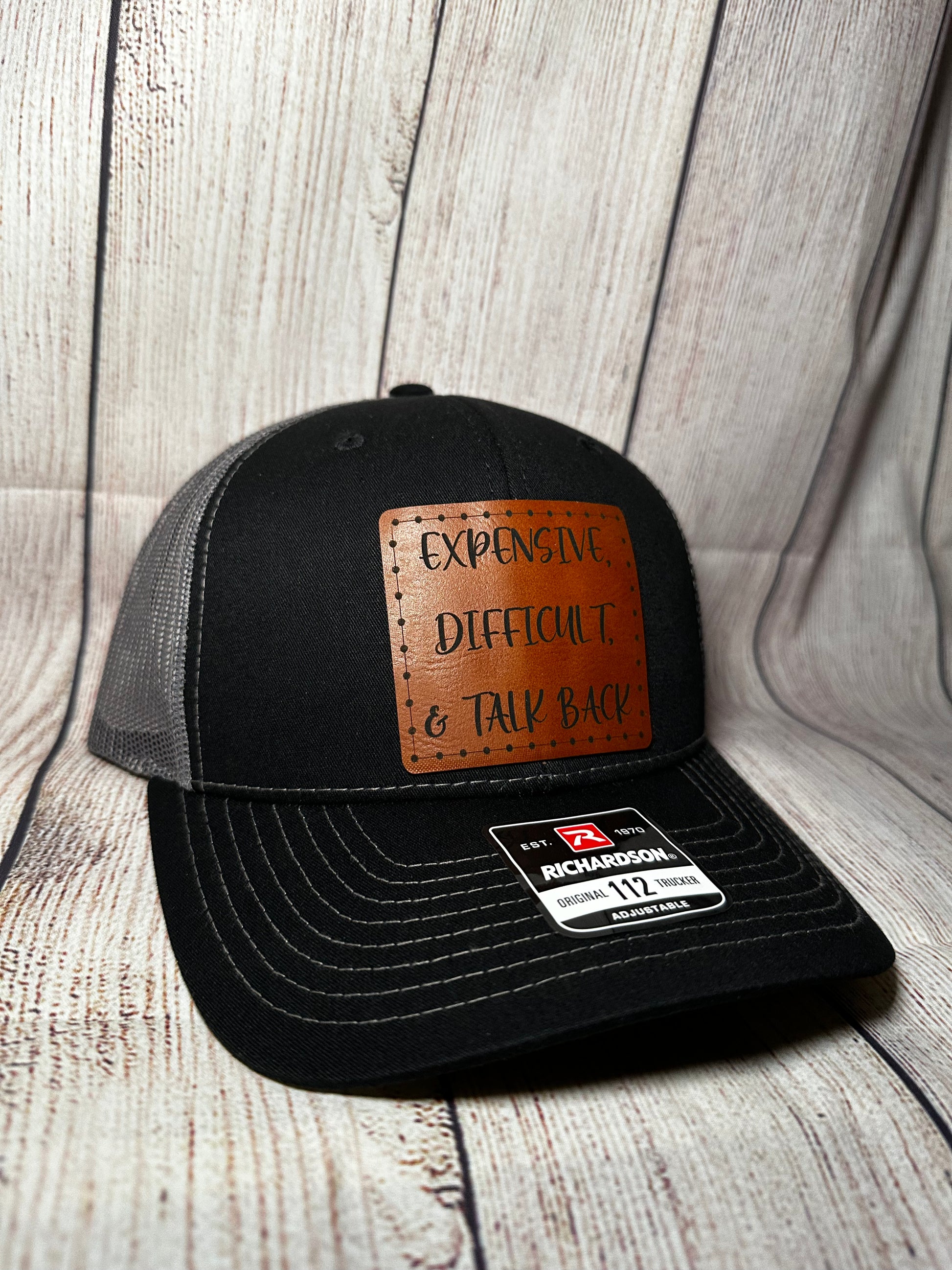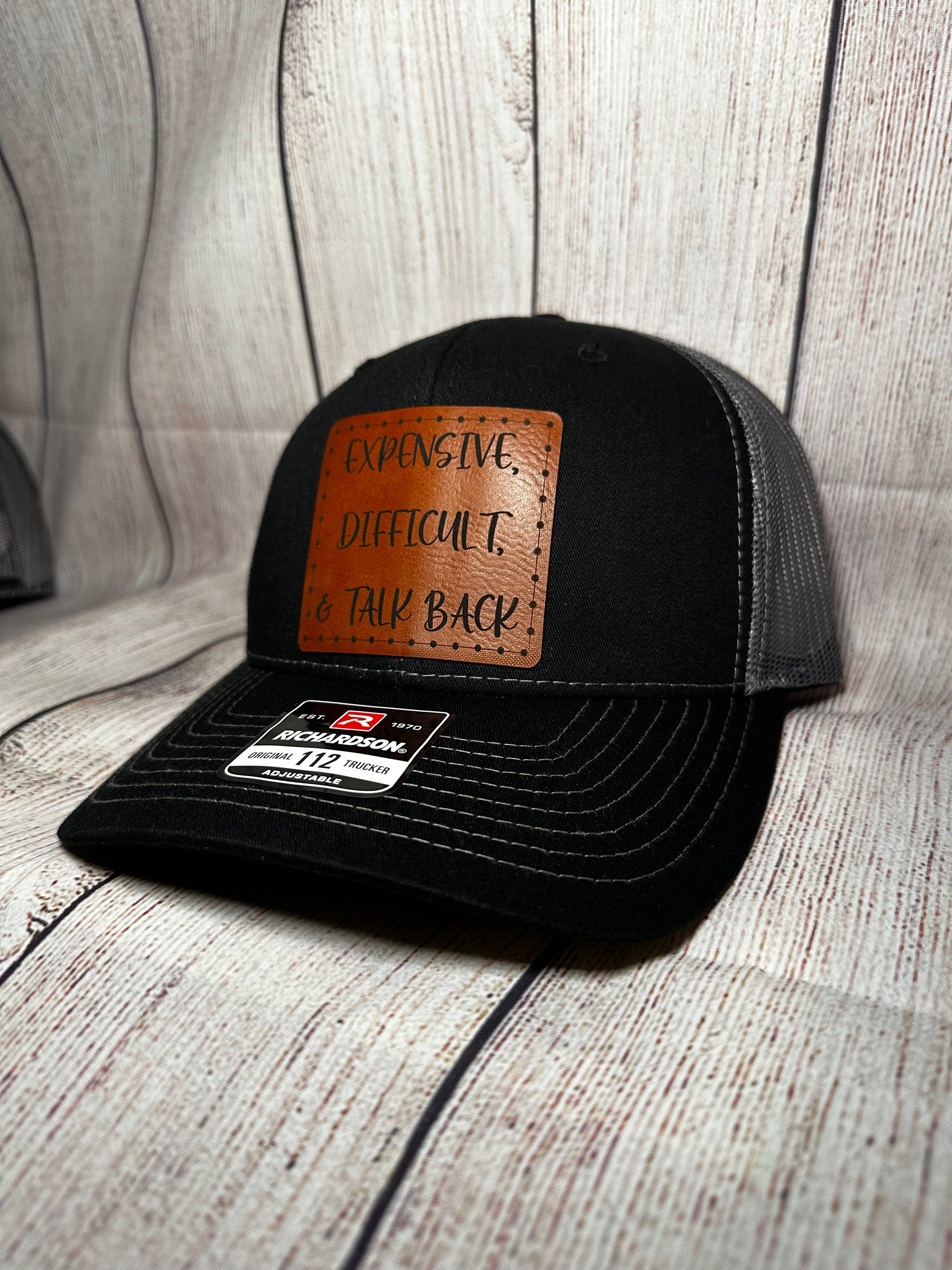 Richardson 112 hat with a leather patch "Expensive, Difficult, & Talk Back" Who else can relate?