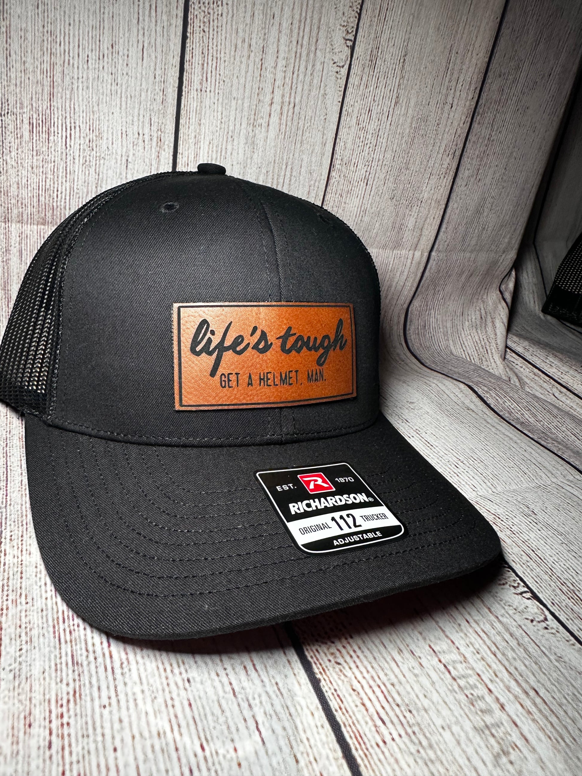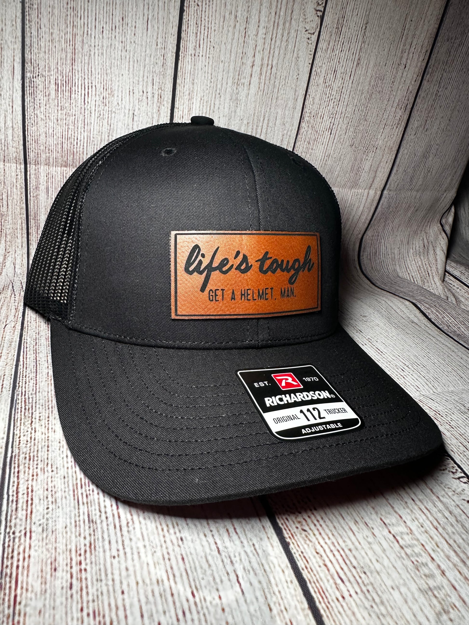 Rawhide leatherette patch on a black hat. Choose flatbill or curved bill!