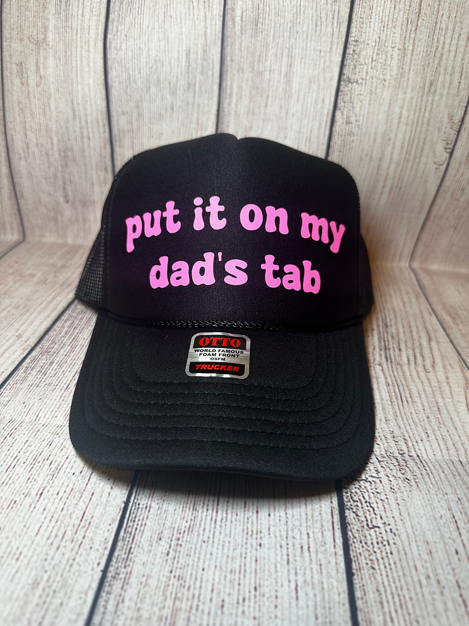 Otto Trucker hat with vinyl saying "put it on my dad's tab" If you want a different color hat or vinyl than what is listed, reach out and we can make it happen!