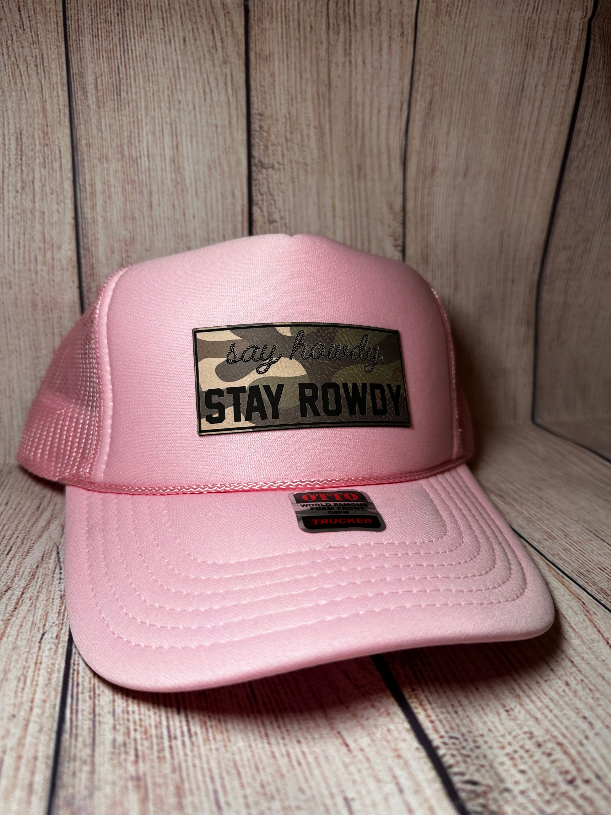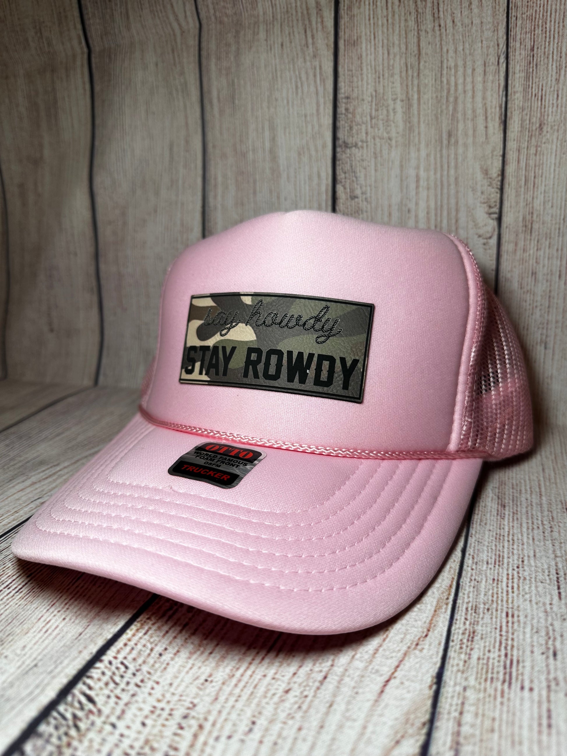 Light pink trucker hat with camo leatherette patch